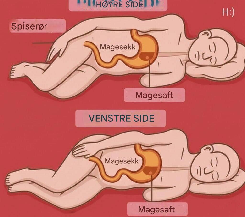 En studie fra 2022 i American Journal of Gastroenterology fant at søvn på venstre side reduserte eksponeringen for syre i spiserøret betydelig sammenlignet med søvn på høyre side hos pasienter med refluks. Forskjellen var dramatisk nok til at forskere nå rutinemessig anbefaler denne stillingen som en del av refluksbehandling.