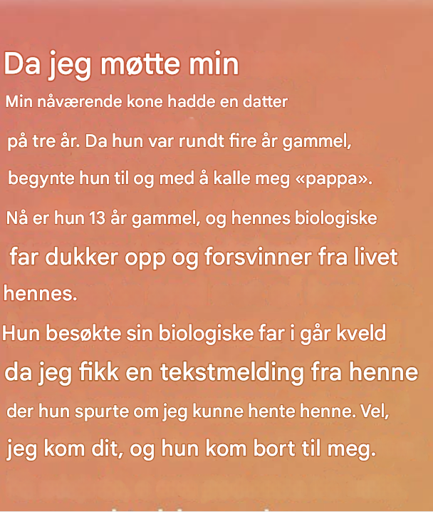Hun var tre år da jeg møtte henne – krøllete hår, et skeptisk blikk og en utstoppet sjiraff klemt rundt henne som en rustning. Da hun var fire, begynte hun å kalle meg «pappa», som om det alltid hadde vært navnet mitt. Nå er hun tretten. Hennes biologiske far dukker opp og forsvinner som dårlig vær. I går kveld var hun sammen med ham da telefonen min lyste opp: