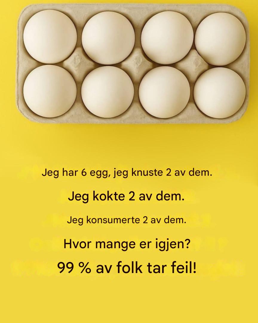 «Jeg har 6 egg. Jeg knuste 2. Jeg stekte 2. Jeg spiste 2. Hvor mange egg har jeg igjen?» Ved første øyekast tenker vi: det er enkelt. På få sekunder gir vi et svar, nesten automatisk. Og likevel ... tar de fleste feil. Hvorfor? Fordi denne gåten leker med refleksene våre og måten vi analyserer på. Kom igjen, la oss analysere den sammen?