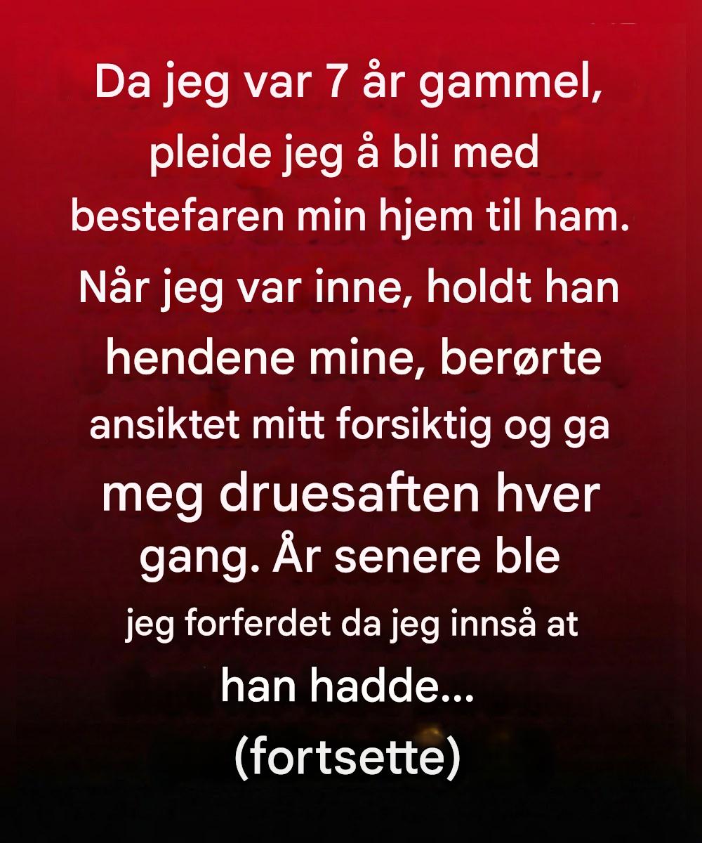 Det føltes viktig, selv om jeg ikke kunne ha forklart hvorfor. Jeg gikk ved siden av ham fra hjørnebutikken til det lille huset hans i den andre enden av kvartalet, med hånden min trygt klemt i hans, som om det var jeg som sørget for at vi kom trygt frem. Vel inne, utspilte alt seg på samme måte hver gang. Han holdt hendene mine, observerte ansiktet mitt intenst og smilte mykt før han helte meg to glass druejuice. Han snakket sjelden, men måten han fokuserte på meg på, gjorde at rommet føltes rolig og skjermet. For meg var det ikke noe mer enn vår private vane, et forsiktig avbrekk i en ellers vanlig barndom.