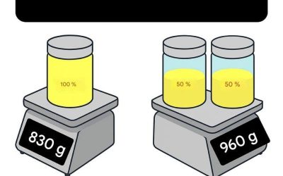 Data (gitt) En full beholder på en vekt veier 830 g. To halvfylte beholdere på en vekt veier 960 g…