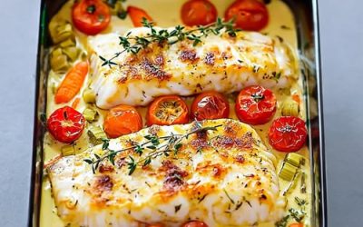 Ovnsbakte torskefileter med fløte og grønnsaker