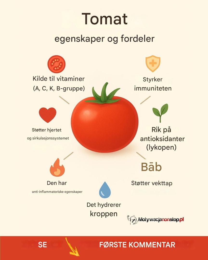 Tomater er en utmerket kilde til mange vitaminer: vitamin C støtter immunforsvaret og akselererer sårheling, vitamin A støtter synet og hudens tilstand, og vitamin K bidrar til riktig blodkoagulasjon.
