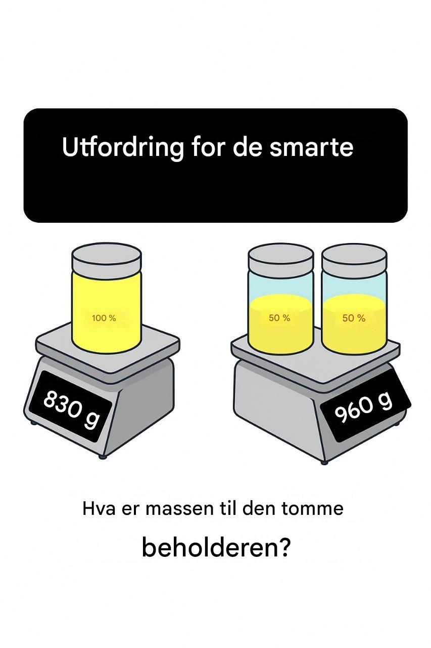 Fra de to halvfylte beholderne: hver har 0,5 𝐿, så væskene summerer seg til L. Ligningen for vekt er: